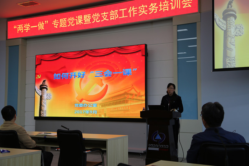 随后,党委办公室主任王晓慧为支部书记做《如何开好“三会一课”》辅导报告。作为支部书记第一次轮训内容,报告主要针对目前基层支部开展“三会一课”实施中存在的突出问题,回顾了“三会一课”制度的产生历史和发展过程,详细讲解了“三会一课”的内容、会议要求和操作流程,强调了开好“三会一课”的三个方面:一是必须坚持讲政治、讲党性,这是践行“三会一课”制度的核心和灵魂。二是要坚持弘扬主旋律、激发正能量,不能喧宾夺主,不能异化蜕化。三是要增强针对性和实效性。坚持组织要求与党员需求的有机统一,要根据党员意见建议提高针对性、精准性和实效性;坚持党支部工作与业务工作的有机统一,通过加强支部工作促进业务工作的开展,通过做好业务工作落实党支部要求,推动事业发展;坚持继承传统与创新形式的有机统一,通过互联网+党建、邀请专家学者、先进典型讲党课、现场观摩教育等改进组织生活的形式。报告还对近期党委部署的向南仁东先生学习、“我在团队中的位置”主题讨论、“喜迎十九大,畅谈新变化”主题党日等重点工作进行了布置,并要求各支部严格按照时间节点完成工作任务。
