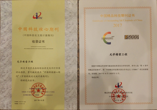 长春光机所主办的五种期刊成果丰硕。五种期刊全部进入《2017年版中国科技期刊引证报告(核心版)》,成为中国科技论文统计源期刊。其中Light:Science & Applications、《光学精密工程》、《中国光学》获得“第四届中国精品科技期刊”即“中国精品科技期刊顶尖学术论文(F5000)”项目来源期刊。《中国光学》和《发光学报》分别有2篇和1篇论文被评选为“中国百篇最具影响国内学术论文”。《中国光学》影响因子1.821,再次位列物理学类(37种)和光电子学与激光技术类(27种)期刊第1名。