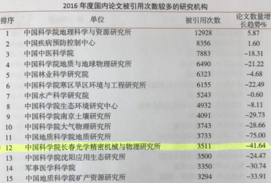 据中国科学技术信息研究所(简称中信所)2017年10月31日发布的《2017中国科技论文统计结果》之“中国卓越科技论文产出状况报告”,长春光机所在研究机构中产出“2016年中国卓越国内科技论文”最多(见图1)。