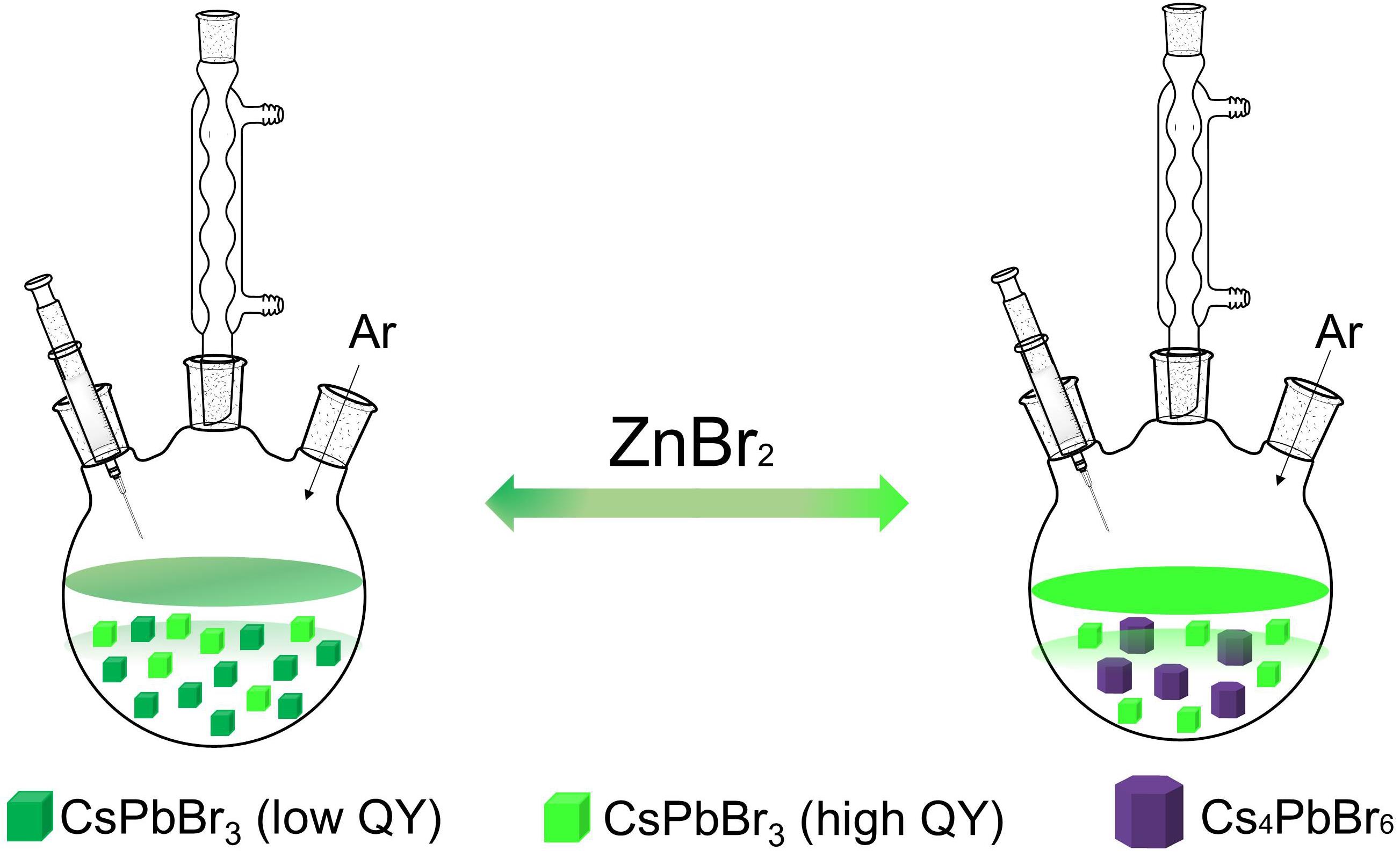 在ZnBr2诱导剂作用下CsPbBr3和Cs4PbBr6钙钛矿纳米晶结构转换的示意图