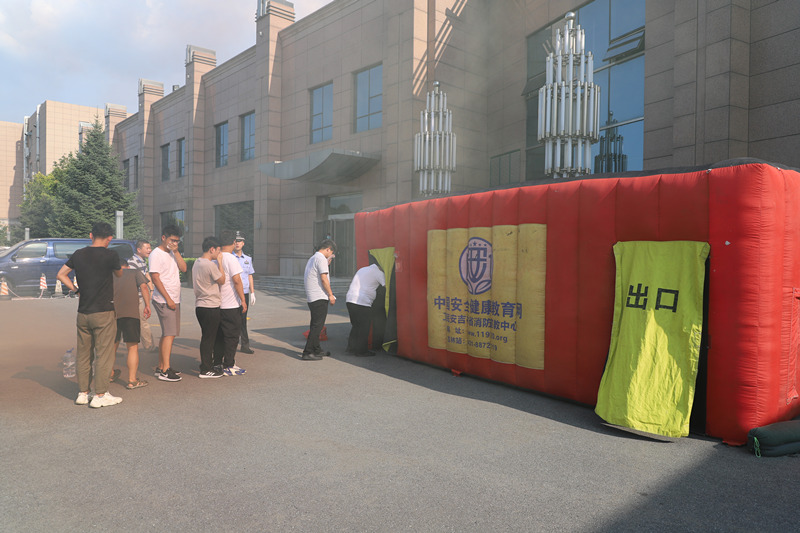 疏散完毕后,参演人员在集合点进行消防帐篷逃生体验,帐篷内设置了蜿蜒曲折的模拟逃生通道,模拟火灾环境。参演人员表情严肃,态度认真,放低身体姿态,以湿毛巾捂口鼻,多人一组进入帐篷体验火灾环境,经过一番摸索从出口迅速逃出“火灾现场”。