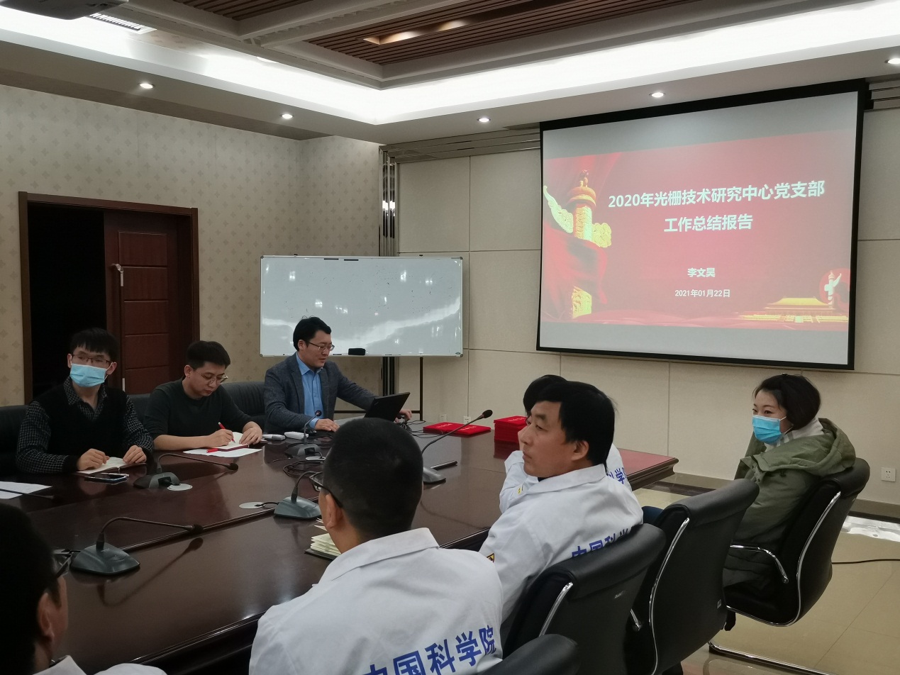 会议第一项,支部书记李文昊对光栅中心党支部2020年度党务工作进行了总结。2020年,光栅中心以习近平新时代中国特色社会主义思想为指导,深入贯彻党的十九大和十九届二中、三中、四中、五中全会精神,在长春光机所党委的正确领导和悉心关怀下,在中心全体同志的辛勤努力下,光栅中心党支部在党务工作上取得一定成绩。“两学一做”教育趋于常态化,支部特色主题党日活动“‘不忘初心,牢记使命’——离退休同志讲述中国光栅奋斗史”持续开展,“传承与关爱”——慰问光栅中心八位老同志,申请并获批的所党建课题,学习强国”积分全所排名较2019年有较大幅度提升等。然而,仍存在党建促进科研的效果不明显,党建引导团建工作不系统,部分党员同志组织性、纪律性不强等问题。李文昊强调,下一步要充分加强党对科研工作的全面领导,系统发挥党建对团队建设的促进作用,“不忘初心,牢记使命”为光栅事业的传承和发展努力奋斗。