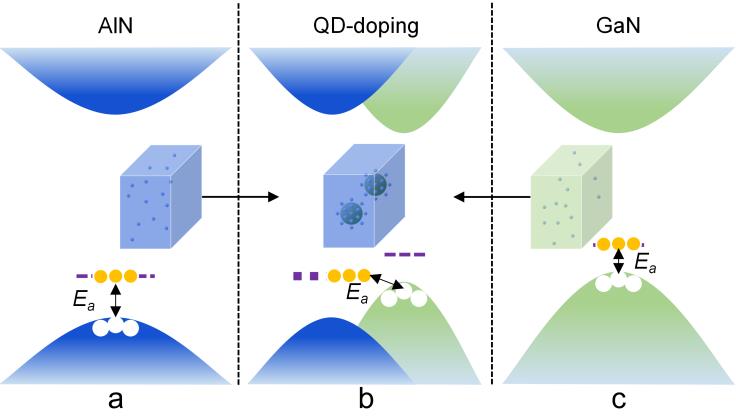 图:Mg受主均匀掺杂在(a)AlN和(c)GaN中均表现出高激活能,(b)当将GaN量子结构引入AlN中,并将掺杂剂掺杂于AlN基质中、富集在量子结构周围时,体系的价带顶将由GaN量子结构决定,基质中的受主杂质可释放空穴。
