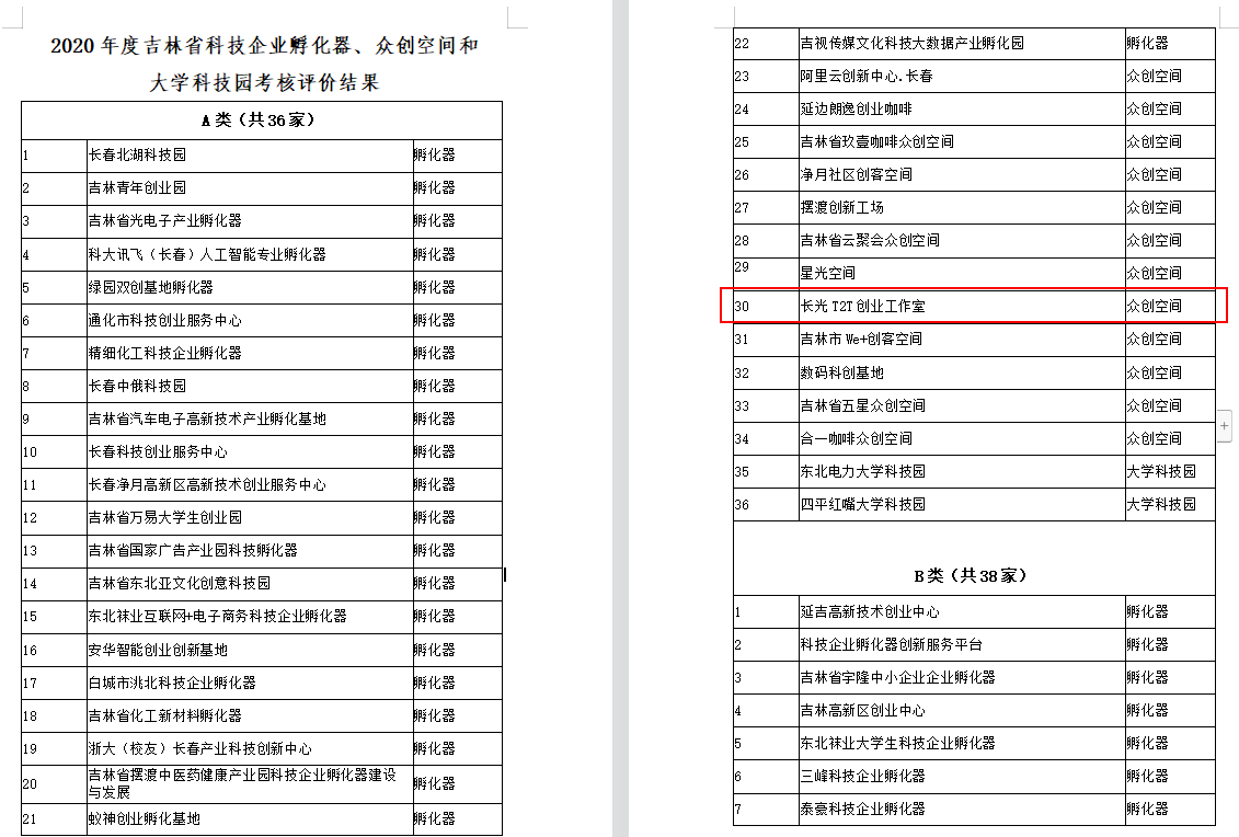 近日,吉林省科学技术厅发布了《关于公布2020年度吉林省科技企业孵化器、众创空间和大学科技园考核评价结果的通知》,为引导吉林省科技企业孵化器、众创空间和大学科技园高质量发展,提高服务水平,更好地发挥科技企业孵化器、众创空间和大学科技园的示范带头作用,对全省科技企业孵化器、众创空间和大学科技园进行了考核评价,经过自我评价、专家评审、厅党组会审议等严格评价流程,长光T2T创业工作室于60家众创空间中脱颖而出,获评为优秀(A类)国家级众创空间。