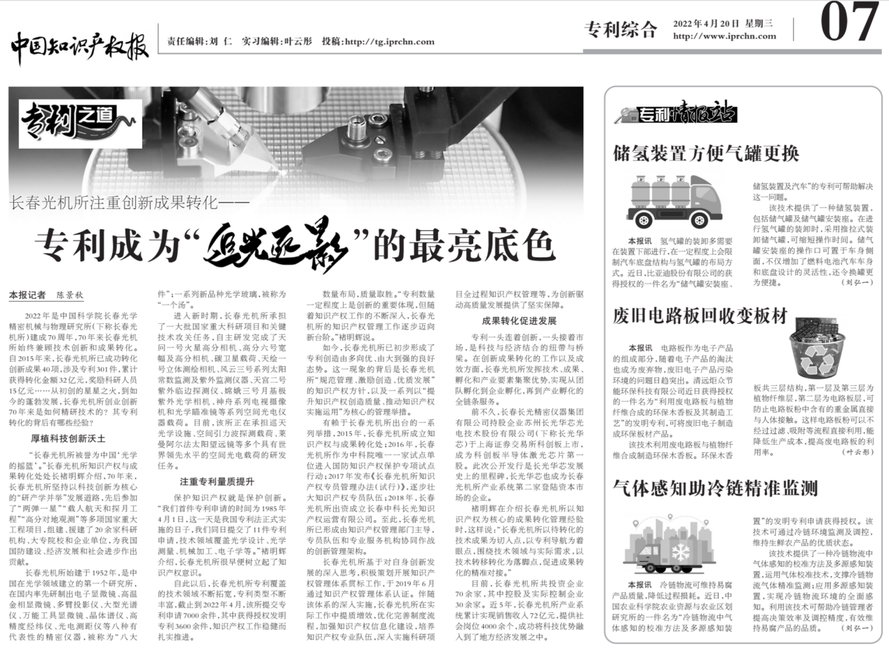 同日,《中国知识产权报》发表了名为《长春光机所注重创新成果转化——专利成为“追光逐影”的最亮底色》的文章,展示了长春光机所对知识产权的重视,以及在知识产权和成果转化方面一系列有效举措及获得的成绩。中国知识产权资讯网也同步转载了该报道。