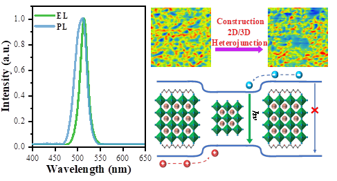 钙钛矿材料由于其优异的半导体性质在光电器件应用领域得到了广泛的关注。但原位生长的三维钙钛矿具有的低激子结合能,使得自由载流子容易被缺陷态捕获,制约了其电致发光器件效率的提升。因此通过引入大的有机间隔阳离子就可以得到具有高激子结合能的准二维钙钛矿结构,极大地提升电致发光效率,但准二维钙钛矿中复杂的低维相分布问题是抑制其效率进一步提升的关键阻碍。
