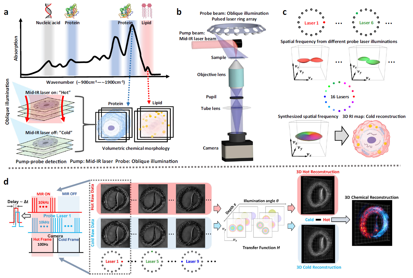 光学显微成像技术在现代生物学研究和临床医学中具有重要应用,其对亚细胞结构的可视化和定量化能力可以使科学家们更加深刻地理解细胞生理学。在众多光学显微成像方案中,中红外光热(MIP)显微镜具有无标记指纹识别生物大分子并将其可视化的优点,并且突破了传统红外光谱显微镜的低分辨率和低速率的限制,因此受到科研界的广泛关注。然而,现有的MIP显微镜所存在的体成像速度慢、深度分辨率低,难以定量成像等难题,是制约该技术发展的主要瓶颈。
