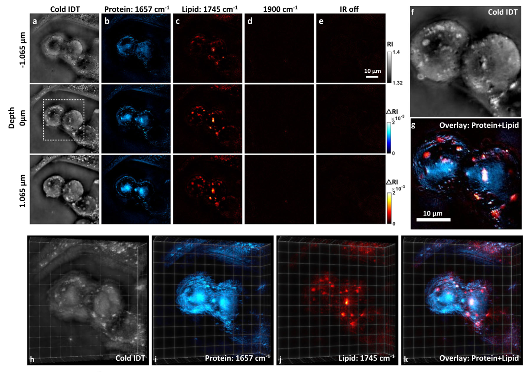 图2 膀胱癌细胞的BS-IDT成像图。有丝分裂下固定膀胱癌T24细胞的三维化学成像,介质是 D2O PBS。