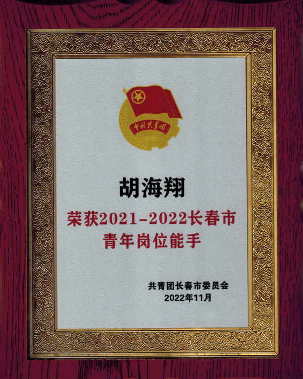 近期,共青团长春市委发布了《关于命名2021-2022年度长春市青年岗位能手的决定》(长团发〔2022〕10号),授予来自长春市各行业的107名同志“长春市青年岗位能手”称号。经长春光机所团委推荐,光学室胡海翔获得2021-2022年度长春市青年岗位能手荣誉称号。
