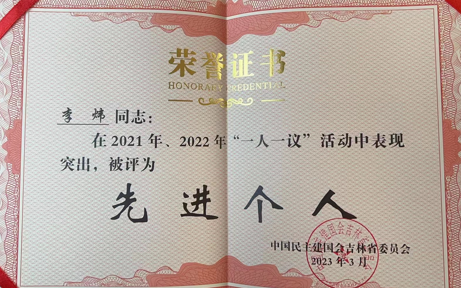 近日,民建吉林省直工委2021、2022年总结表彰大会隆重举行。会上,民建吉林省直工委对2021、2022年度表现突出的基层组织和先进个人进行了表彰。民建省直长春光机所支部荣获民建吉林省委2021、2022“一人一议”活动先进集体;民建长春光机所支部主任、Light中心主任白雨虹,民建吉林省委委员、光子室主任李炜荣获民建吉林省委2021、2022“一人一议”活动先进个人。