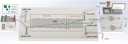 研究人员使用液滴形微柱新开发了临界尺寸为8μm和13μm的两级阵列DLD芯片,该芯片结构简单,重复性好,对CTCs的分选纯度为98.25±2.48%,回收效率为96.30±2.10%,通量高达2mL/min,性能达到国际先进水平。该文研究的相关内容是在国家自然科学基金国家重大科研仪器研制项目《多色拉曼光谱微流控芯片高通量稀有细胞分选系统》的支持下,联合清华大学、吉林大学团队于今年3月完成。