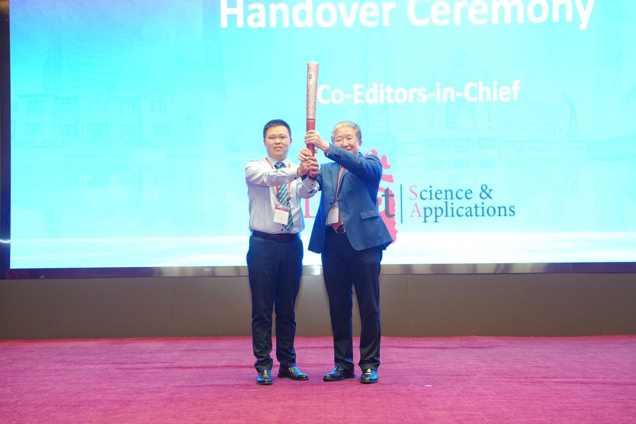 大会由长春光机所副所长张学军主持。开幕式上,长春光机所所长贾平代表主办单位致欢迎辞,他首先感谢与会嘉宾的到来,以及对长春光机所与Light Conference Week 2023的支持。长春光机所被誉为“中国光学的摇篮”,不仅致力于推动光学技术的创新,也积极促进学术交流与合作,与全球光学界共同探索光学发展的未来,并希望通过本次会议与大家开展国际合作项目,培养创新伙伴关系,共同促进光学事业的蓬勃发展。英国牛津大学教授、大会共主席Martin Booth代表大会组委会欢迎各位莅临本次Light盛会。大会涵盖了激光制造与加工、微纳光子学、光学成像与计量等多个主题,吸引了来自13个国家和地区的近500名参会者,旨在促进光科学与技术领域的研究与发展。Light不仅具有科学意义,还象征着知识和智慧的传播。他希望本次大会能成为与会者进行学术交流和思想碰撞的平台,从而推动光科学和技术的进步,像光一样照亮人类发展的道路。吉林省人力资源和社会保障厅党组成员、副厅长黄明代表吉林省人力资源和社会保障厅向来自海内外的专家学者致以诚挚的问候。他高度肯定了长春光机所为吉林省光电子产业作出的巨大贡献,并表示吉林省人社厅将进一步落实人才强省战略,营造海纳百川引人才的良好氛围,希望通过本次大会宣传吉林、推介吉林,吸引海内外更多人才在吉林这片沃土上创新、创业、创造。科技部原副部长、Light主编曹健林代表Light感谢大家多年来对Light成长的关注与支持。他指出Light的成功主要归功于全体主编、编委和编辑部同仁们的不懈努力、广大科学家的支持与厚爱、以及依托单位和各级政府的鼎力支持。Light一直都在走一条有自己特色的发展之路。曹健林主编清楚地记得在2008年北京奥运会期间作为奥运会火炬手,参加了长春市的火炬交接仪式,当时高朋满座、胜友如云的北京奥运会激发了他和同事们用奥运精神办国际期刊的想法。在开幕式上,曹健林主编以奥运火炬的形式把他当年的光荣传给北京大学肖云峰教授,邀请肖教授接任他本人成为Light共主编,期待他接过这个火炬,以薪火传承的精神,携手共主编俄罗斯科学院外籍院士、美国罗切斯特大学张希成教授等各方专家与Light一起勇毅前行。同时,曹健林主编也将作为荣誉主编,继续参与Light的工作,希望Light品牌期刊的发展秉承奥运精神:更高(品牌知名度)、更快(发表速度)、更强(影响力)。