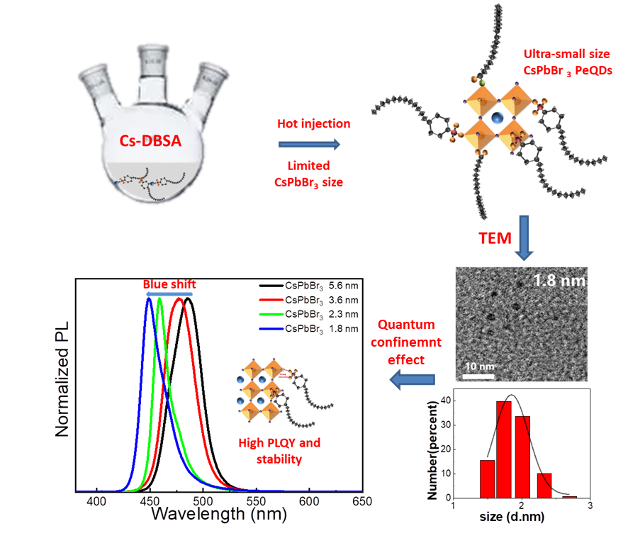卤铅铯(CsPbX3, X = Cl, Br, I)无机钙钛矿量子点(PeQDs)因其优异的光电特性而受到广泛关注。其光学性质可以通过量子限域效应进行调节,但聚焦于胶体PeQDs中强量子效应的报道比较少。一方面,基于PeQDs溶液的多分散特性通常导致更大的量子点尺寸(超过10 nm)。另一方面,随着PeQDs尺寸的减小,很难对其尺寸进行调节,最后会导致PL光谱不均匀展宽,甚至出现双峰或多峰现象。量子点尺寸越小,量子点的PLQY越低,这一直是PeQDs应用的主要障碍之一。目前,具有强量子限域和单峰PL光谱的CsPbBr3 PeQDs的最小尺寸约为4 nm,其PL发射峰为467 nm。但纯CsPbBr3 PeQDs的PL峰蓝移与氯掺杂CsPbBr3 PeQDs相比仍有一定差距。因此,开发一种可靠的方法来实现CsPbBr3 PeQDs的超强量子约束,并将其PL峰调整到深蓝(≤ 450 nm)区域,对于解决氯掺杂CsPbBr3 PeQDs相分离的负面影响具有重要意义。