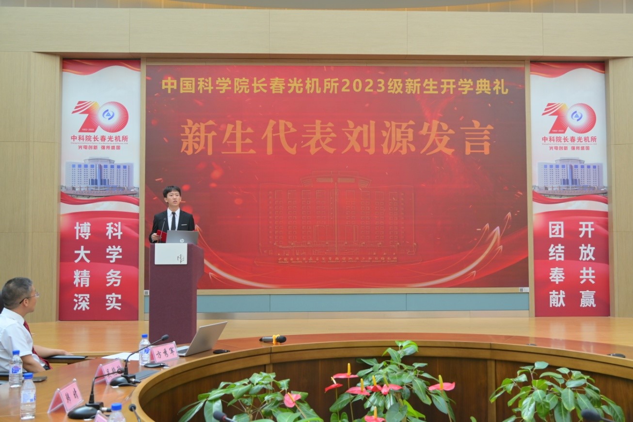 2023级光学工程专业刘源同学作为新生代表,分享了他成功“续约”长春光机所这座光学摇篮,开启人生新旅程后的所思所想。他说,这将是一段充满“大爱”的旅程、坚定“探索”的旅程、矢志“担当”的旅程,号召全体新生以“大爱”为指引,以“探索”为根基,以“担当”为使命,共同书写一段绚丽的研途华章。