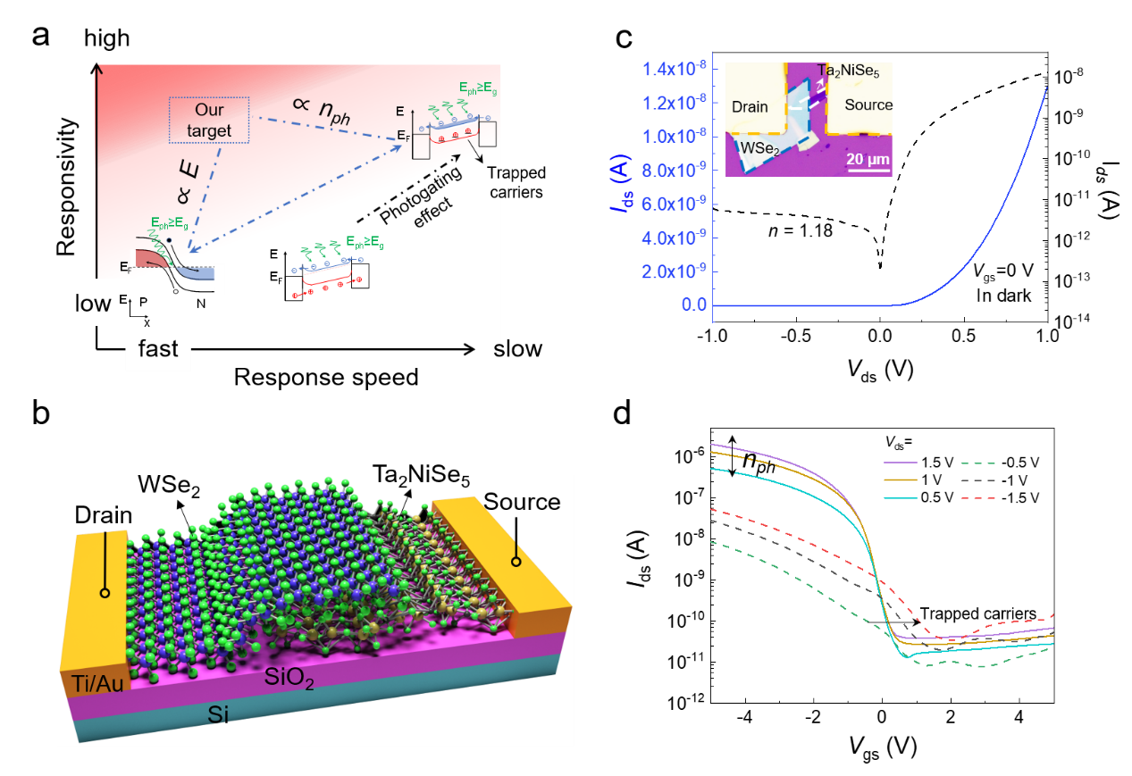 图1.二维异质结构光电探测器中的偏置可调传输行为。a,二维材料光电探测器响应度和速度之间权衡的图示。b,WSe2/Ta2NiSe5异质结构器件示意图。c,暗态下器件的源极-漏极 I-V曲线。d,在白光源照射下,器件在不同源漏偏压Vds下的转移曲线(Ids-Vgs)。
