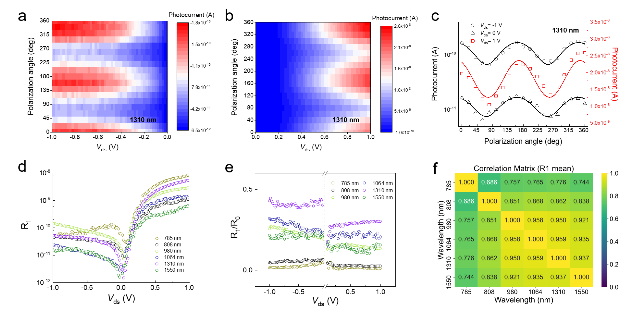 图2.WSe2/Ta2NiSe5异质结中光栅压诱导的偏振光响应和波长分辨能力。a-b,不同偏压Vds 下1310nm照明下的偏振光电流彩色图。WSe2/Ta2NiSe5光电探测器的光响应可以通过Vds和入射光偏振角θ进行调节。c,1310nm 照明下的偏振光电流。不同偏压下的光电流表现出与偏振角θ相同的依赖性。d,从偏振光电流中提取的偏振敏感部分R1 (Vds, l)。 R1取决于偏置电压Vds和入射光波长l。e,各向异性比率β,R1/R0,从偏振光电流的偏振不敏感(R0)和敏感(R1)中提取。f,计算不同波长之间的相关矩阵,相关系数corr{R1(Vds, l=l1), R1(Vds, l=l2)} ,其中l1 和 l2是两个不同的波长。