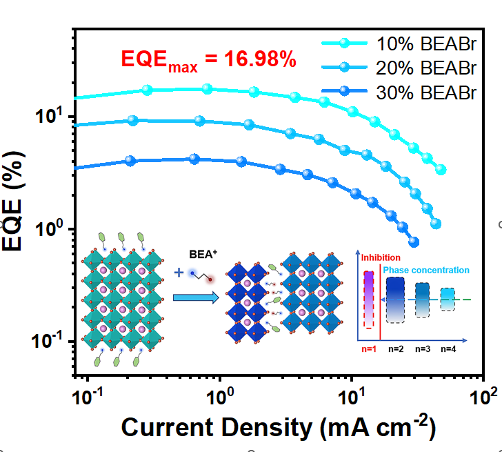 针对这一问题,中国科学院长春光学精密机械与物理研究所发光学及应用国家重点实验室的郭晓阳、吕营和刘星元研究团队采用在绿光的准二维钙钛矿结构中进一步加入双功能间隔配体2-溴乙胺氢溴酸盐来实现纯溴组分钙钛矿的宽带隙蓝光发射。通过间隔配体的氢键和卤-卤键相互作用来减小钙钛矿层之间的弱范德华间隙,有效提升能量转移效率和降低非辐射复合损失,极大地增加了准二维钙钛矿的辐射复合效率。同时,利用混合间隔阳离子体系设计实现了连续且集中的n相分布,避免因不良相分布的问题影响电致发光效率的提升。最终,获得的天蓝光钙钛矿发光二极管在493nm处实现最大EQE为16.98%,同时器件也展现出了较好的运行稳定性。