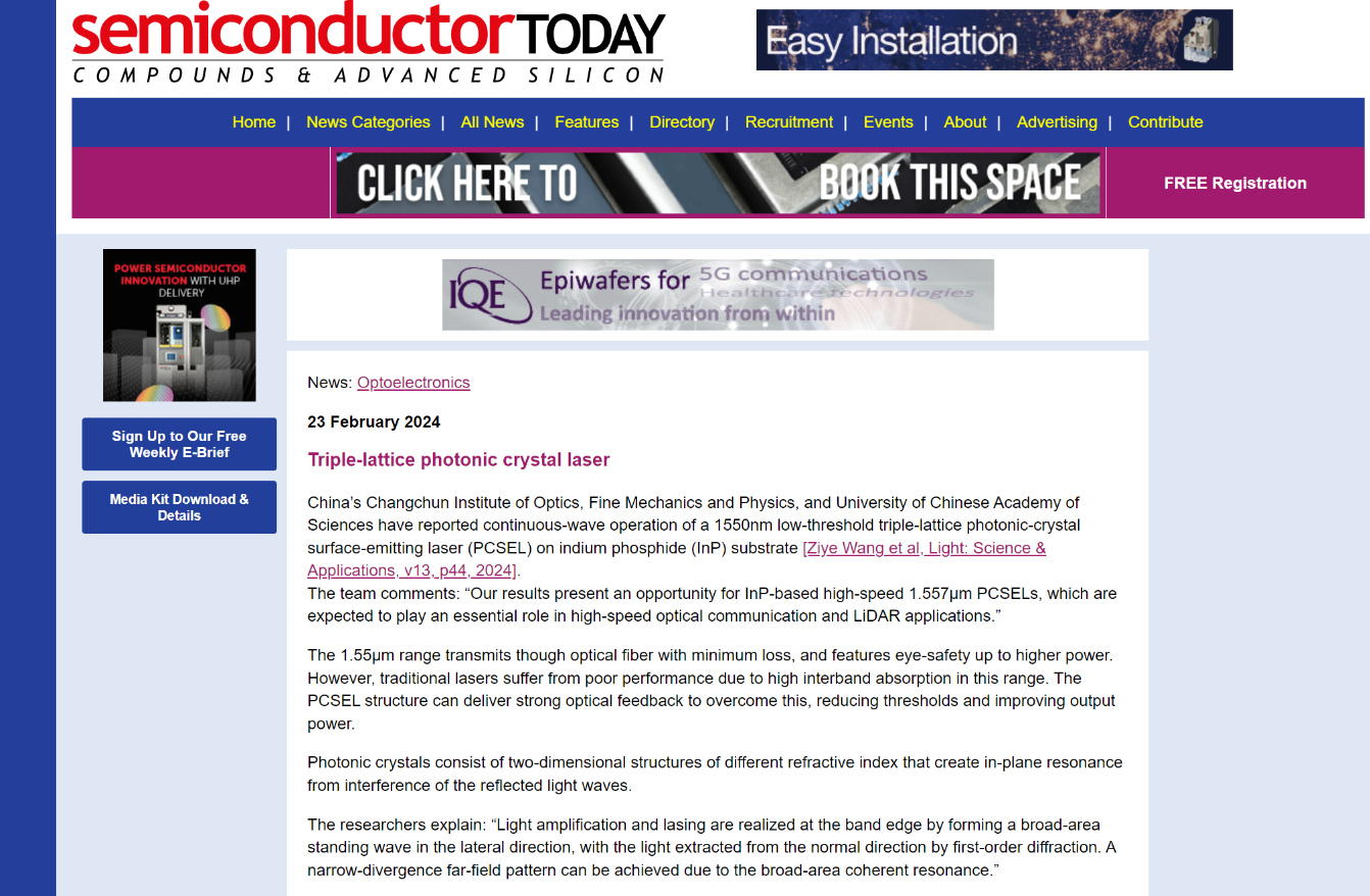 近日,中国科学院长春光机所佟存柱研究员团队在光子晶体面发射激光器(PCSEL)研究领域取得重要进展,提出三晶格结构并实现低阈值1550nm PCSEL,相关成果发表在Light:Science and Application vol.13,44,2024,国际半导体行业著名刊物《Semiconductor Today》以“Triple-lattice photonic crystal laser”为题对该成果进行了新闻特写报道。《Semiconductor Today》指出“ 1.55微米范围的光通过光纤传输损耗最小,且具有人眼安全功率高优点。然而,传统的激光器由于在这个范围内具有很高的带间吸收而性能较差。PCSEL结构可以提供强大的光反馈来克服这个问题,降低阈值,提高输出功率。”