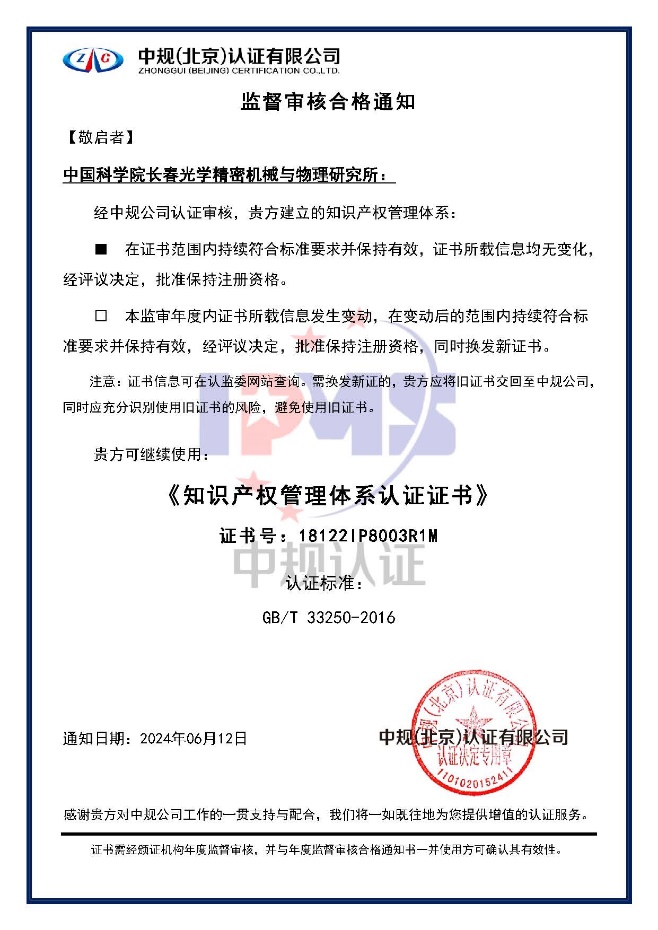 2024年6月6日-7日,长春光机所顺利通过了由中规(北京)认证有限公司专家审核组进行的2024年知识产权管理体系现场监督审核。