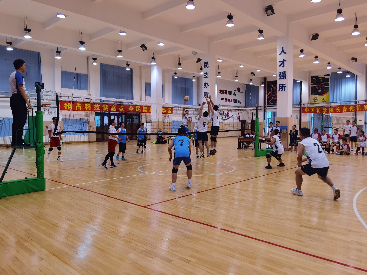 排球场上,男排队员们紧密配合,形成了一道道快速移动的弧线。从场上队员的敏捷移动,到精准的发球和扣球,再到默契的传球和接应,运动员们通过默契的配合和相互支持,展示了团结的力量。通过男排比赛,不仅展现了运动员的个人技能和实力,更展现了我所科研团队的凝聚力和融合度,是对体育精神和团队精神的一种生动诠释。