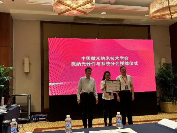 中国微米纳米技术学会微纳光器件与系统分会挂靠于中国科学院长春光学精密机械与物理研究所,是中国微米纳米技术学会下设专业分会之一。大会首先由吴一辉研究员介绍微纳光器件与系统分会前期筹办情况,她首先对筹备过程中王立鼎院士、尤政院士、蒋庄德院士等人的指导表示感谢,对与会领导与分会代表的支持表示感谢。随后刘冲代表学会宣读了中国微米纳米技术学会微纳光器件与系统分会成立登记的批复,随后与李铁共同向分会颁发了登记证书。