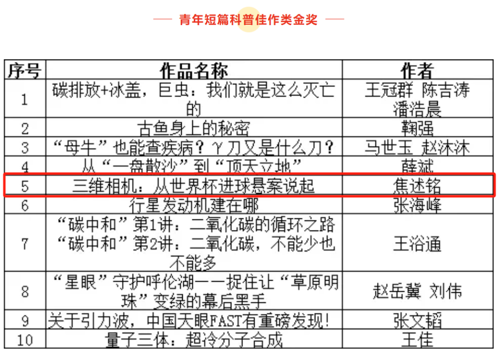 其中,由Light科普坊出品、特约科普作家焦述铭创作的《三维相机:从世界杯进球悬案说起》从众多优秀作品中脱颖而出,斩获“青年短篇科普佳作类金奖”。这一奖项的获得,既彰显了作者的科普创作实力,也展现了Light科普坊在科技传播领域的专业水准。