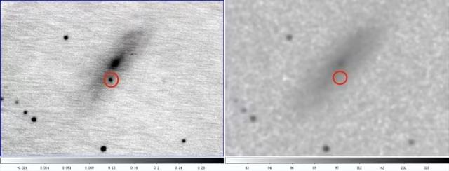 80厘米望远镜拍摄的近红外波段图像(左图,圆圈中为超新星SN2024xal),2MASS两微米全天巡天望远镜拍摄的近红外波段历史图像(右图)