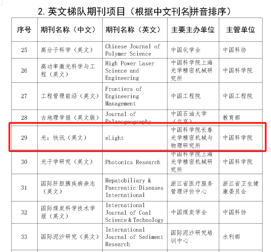 Light期刊在卓越行动计划一期以优秀成绩结题后,再次蝉联英文领军期刊,这不仅是对Light期刊学术品质与影响力的高度认可,更是其坚持追求卓越的见证。而作为Light品牌的冉冉新星,eLight跻身英文梯队期刊,为Light集群增添了璀璨新光。与此同时,《光学精密工程》凭借稳扎稳打的发展步伐,成功入选中文梯队期刊,用实力诠释了匠心精神。
