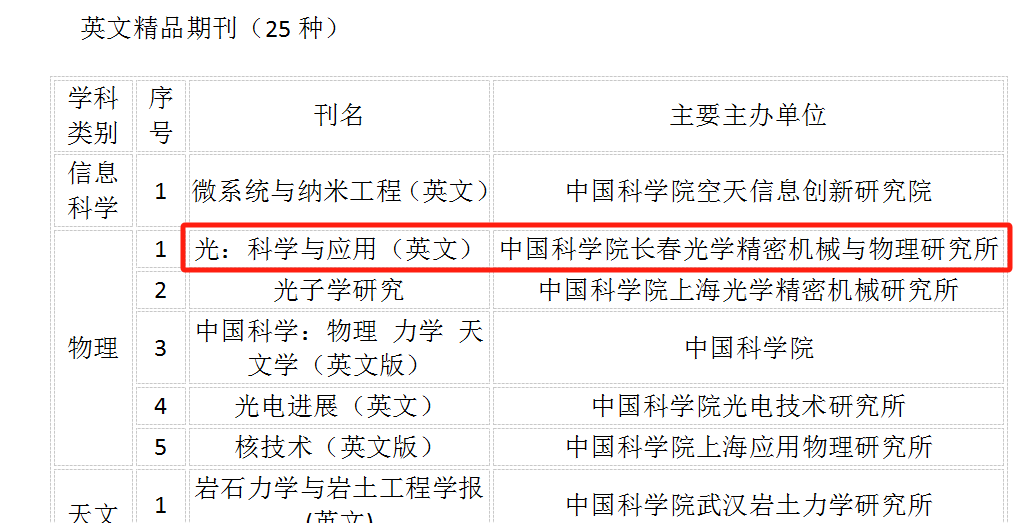 《光:科学与应用》(英文)入选中国科学院英文精品期刊截图