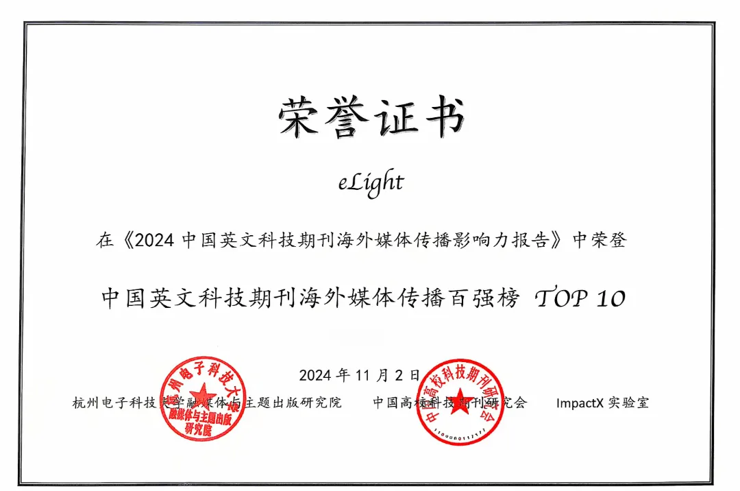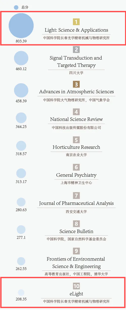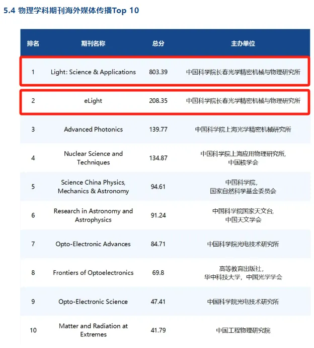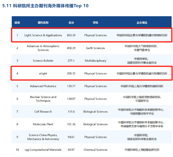 在“ 科研院所主办期刊海外媒体传播Top10”榜单中,《Light:Science&Applications》与《eLight》分别斩获第一名与第四名。