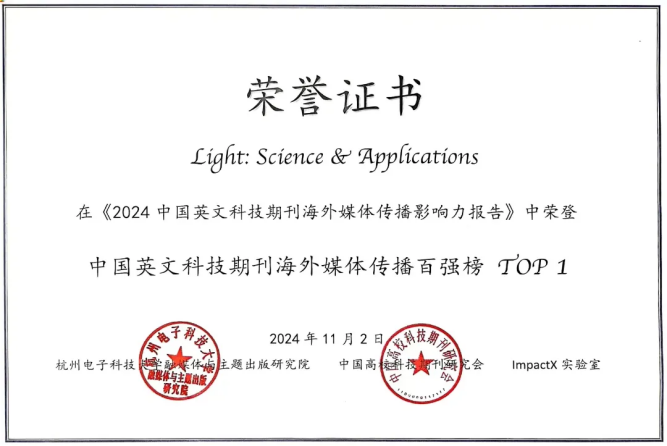 在中国英文科技期刊海外媒体传播百强榜单中,《Light:Science&Applications》荣登榜首,《eLight》位列第十名。