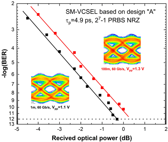 针对这一问题,长春光机所Bimberg中德绿色光子学研究中心团队提出基于氧化孔径优化、光子寿命调控、增益腔模失配的VCSEL设计方法,获得高速单模VCSEL芯片,提升调制带宽并降低功耗,实现100m光纤条件下基于NRZ调制60Gb/s无误码传输速率,功耗98fJ/bit@50Gb/s、168fJ/bit@60Gb/s,指标达同类型器件国际先进水平。
