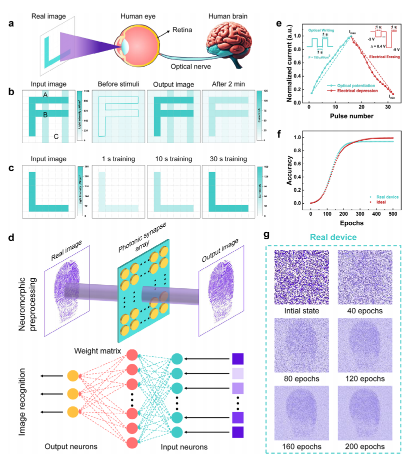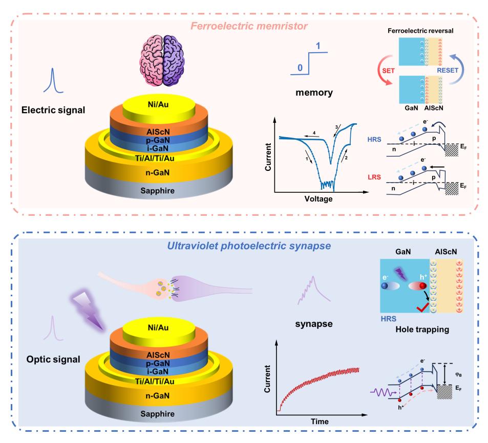 相关成果以标题为 “Ultraviolet Optoelectronic Synapse Based on AlScN/p-i-n GaN Heterojunction for Advanced Artificial Vision Systems”发表在《Advanced Materials》上。文章链接:https://doi/10.1002/adma.202419316。