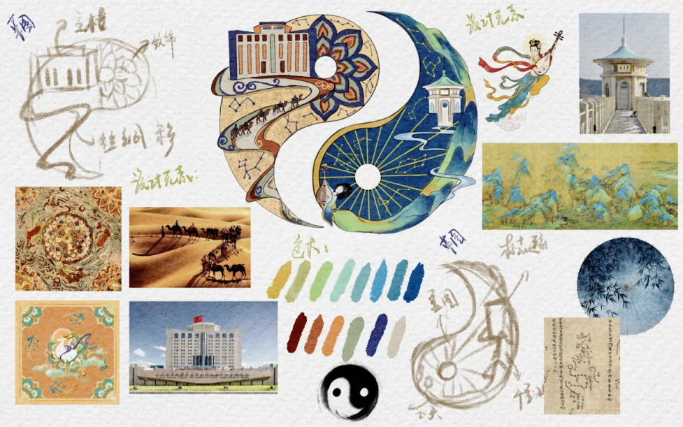 等奖则分别由01组、04组、13组摘得。01组的作品《寻光古今》,以阴阳八卦为基,分为阳极与阴极。阳极选取敦煌色与丝路驼队,点缀莲花纹与星空,象征长光科研精神与深空探索;阴极则融合《千里江山图》与江南山水,将琵琶、飞天下藏星图的油纸伞等元素与长春净月潭云雾相结合。该作品通过阴阳合璧的形式,展现了西北大漠与江南青绿的激烈碰撞,更深刻诠释了对立统一的东方哲思,完美地将长春光机所的科研探索精神与传统文化内涵相融合,呈现出独特的创意与深厚的文化底蕴。