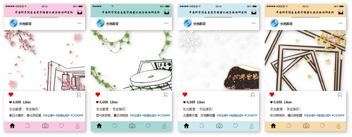 13组的《长光四季透卡》则以四季轮回隐喻研究生成长历程(春萌至冬藏),采用长春光机所标志性场景作为边框,构建虚实相生的社交媒体界面形态。动态点赞等元素实体化社交互动,毕业生可持卡至对应地点打卡拍照,将科研记忆定格为可触摸的时空坐标。作品通过创新的设计理念,将科研与生活紧密结合,展现了长光学子对科研旅程的独特感悟。