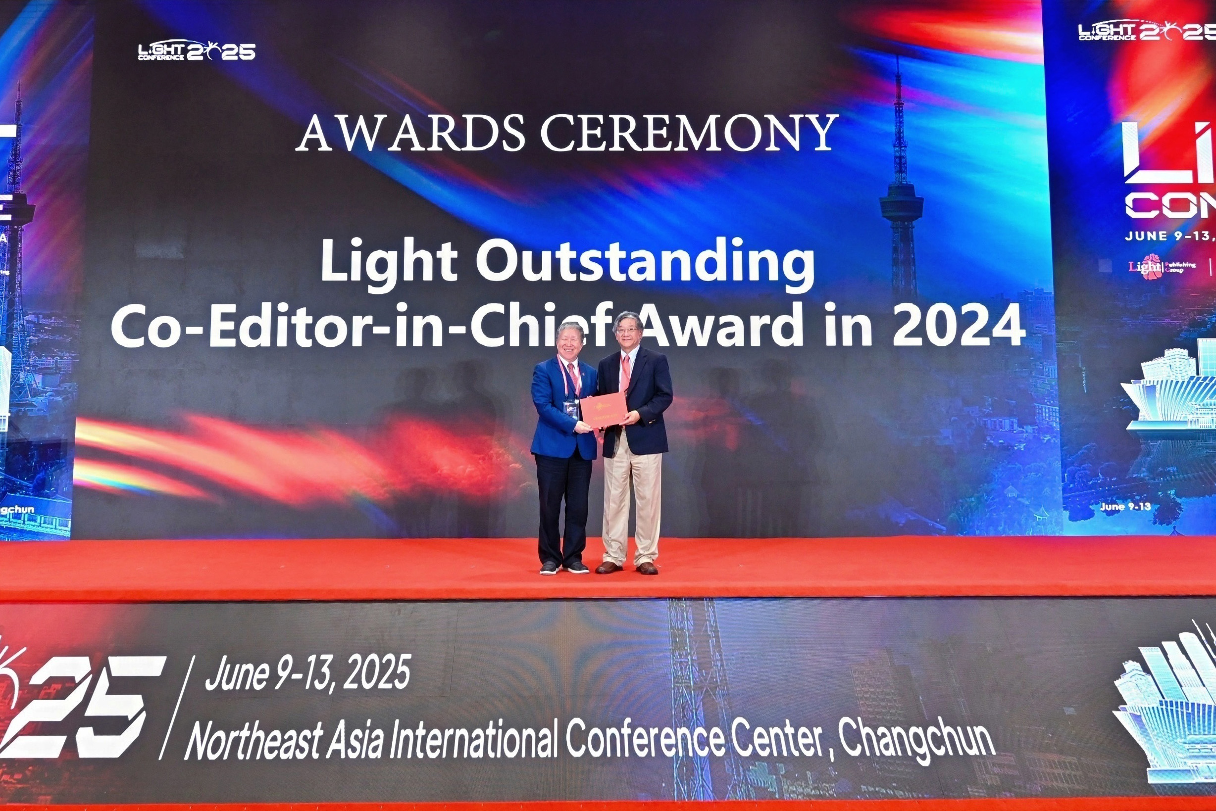 Light创刊主编曹健林,中国科学院院士王立军,中国工程院院士、中国科学技术大学环境科学与光电技术学院执行院长刘文清,中国科学院院士、中国光学学会理事长、中国人民解放军总医院主任医师顾瑛,中国工程院外籍院士、澳大利亚两院院士、上海理工大学校务委员会执行主席顾敏,中国科学院院士、东北师范大学教授刘益春,中国工程院院士、长春光机所所长张学军,俄罗斯科学院外籍院士、美国罗切斯特大学讲席教授、Light共主编张希成,国际电气与电子工程师协会光子学会主席、南方科技大学讲席教授沈平,长春光机所总师、Light执行主编贾平,清华大学教授、Light执行主编孙洪波,香港科技大学教授、Light执行主编张霜,中国科学院长春分院院长金宏,分别为优秀主编、2位优秀执行主编,到场的10位优秀编委、5位优秀审稿人、9位优秀论文获奖者颁奖。