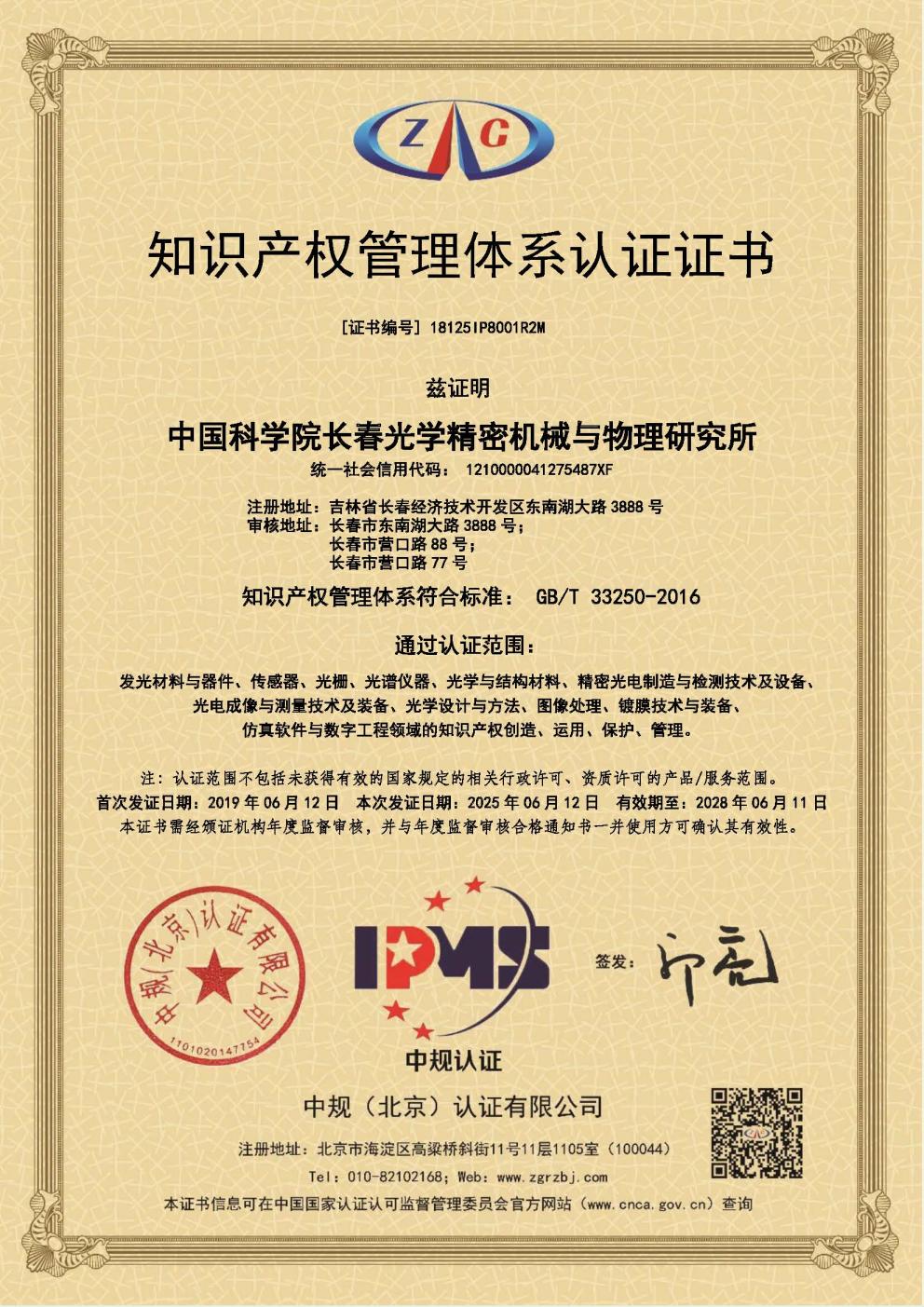 2025年6月12日,长春光机所获得了由中规(北京)认证有限公司颁发的知识产权管理体系认证证书。
