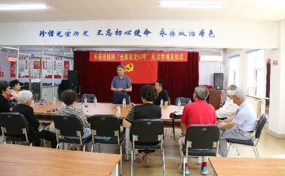 长春光机所党委副书记、纪委书记孙焕出席颁发仪式并讲话。他指出,颁发纪念章的意义十分重大,既是一种致敬,更是一种激励,增强党员的荣誉感、归属感、使命感;激励年轻党员传承老一辈共产党员的光荣传统和优良作风,坚定信念,凝聚力量,始终保持革命者的大无畏奋斗精神;展现了对老党员几十年来忠诚党的事业、践行党的宗旨,兢兢业业为党工作、踏踏实实为群众服务的敬重和肯定。