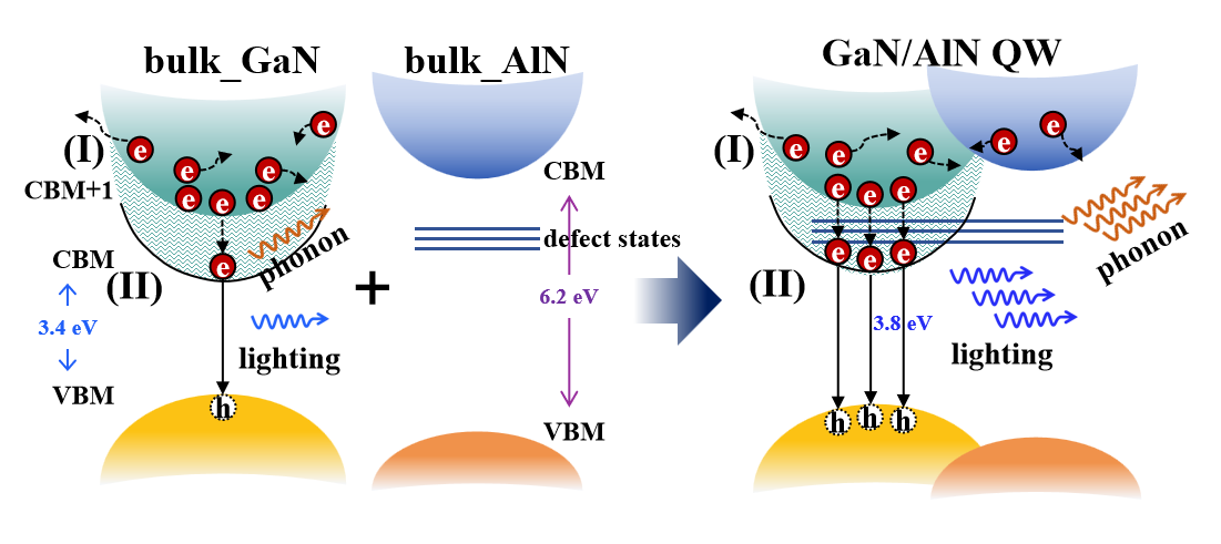 本研究首次提出通过调控GaN/AlN量子阱界面的氮空位缺陷,实现对电子冷却速率的有效增强。这些缺陷能级不但作为“台阶”提升了导带连续性,而且能够显著加强电子-声子相互作用,从而加速电子向导带底冷却。第一性原理计算表明,该策略可使电子冷却时间缩短超过一个数量级,有效实现与空穴冷却速率的动态平衡,大幅提升发光效率。与传统EBL结构相比,该方法无需额外结构设计,即可实现电子动力学的精准调控。该研究还进一步拓展了半导体缺陷物理的研究边界,系统验证了缺陷在调控器件性能方面的“有益性”作用,颠覆了缺陷的传统认知,为新一代电子与光电子器件的缺陷工程设计提供了理论支撑和新思路。