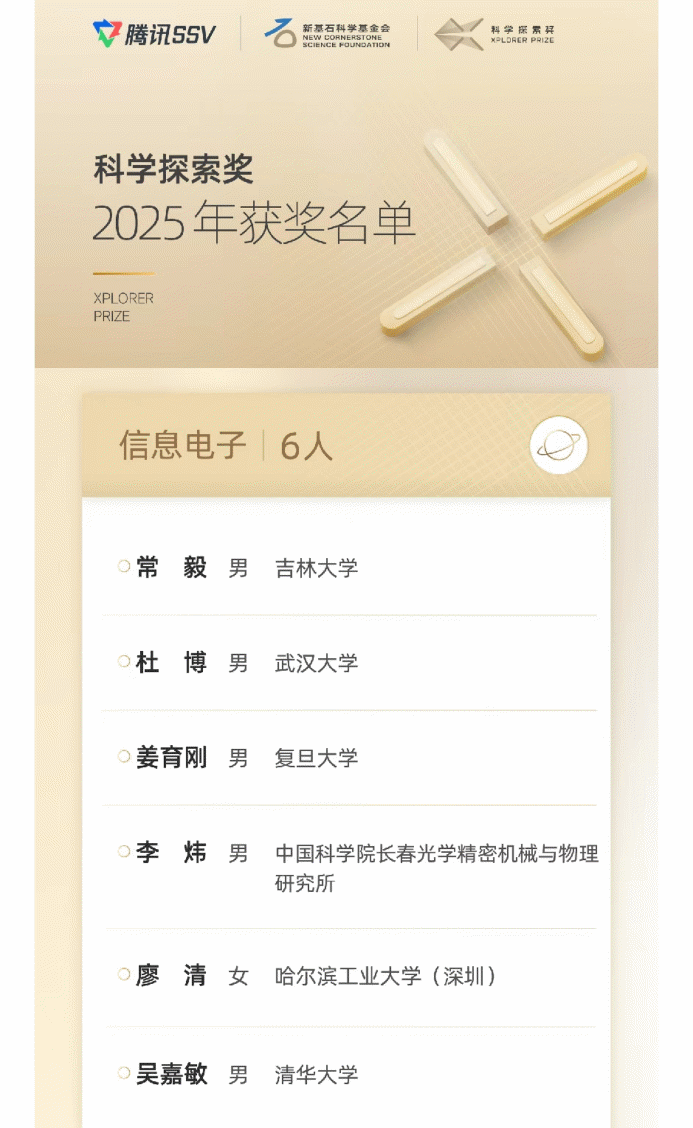 “科学探索奖”是由新基石科学基金会设立、科学家主导的公益奖项,旨在支持中国内地及港澳地区45周岁以下(女性48周岁以下)的青年科技工作者。该奖项每年评选不超过50人,每人获300万元奖金分5年发放,覆盖数学物理学、生命科学等10个领域。2025年第七届获奖者中,女性占比18%创历史新高,35岁以下年轻科学家达26%,研究方向包括火星生命探测、人工视网膜修复等前沿课题。该奖项由杨振宁等14位科学家与腾讯马化腾联合发起,至今已资助347位科学家。
