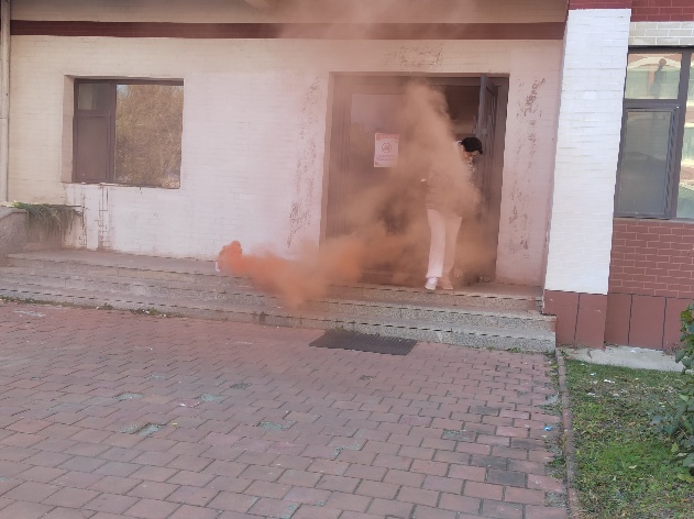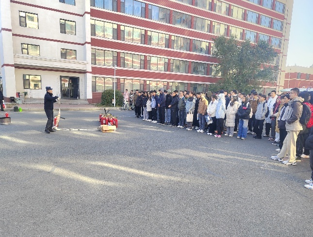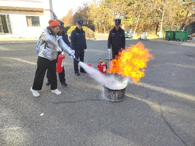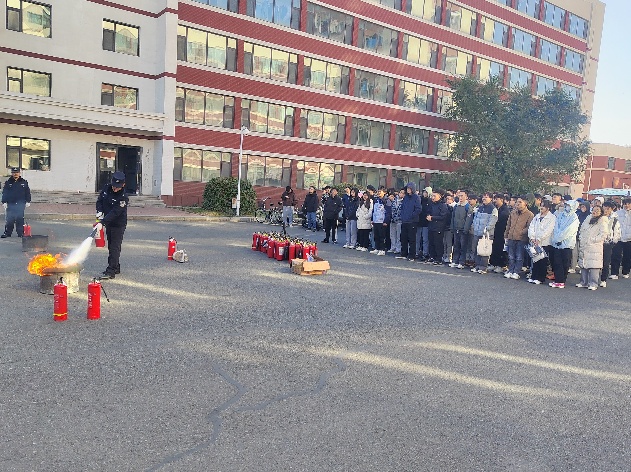 12时55分,研究生部各公寓楼声光警报响起,同时拉开公寓楼下消防演习专用烟雾弹,演练正式开始。研究生们听到警报声后按照指定路线快速有序地撤离到安全区域。到达指定安全区域后,警队人员为研究生讲解干粉灭火器和二氧化碳灭火器的使用方法及注意事项,消防栓的使用流程及水带的连接方法,并指导同学们进行灭火器灭火实操演练。