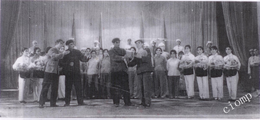 内容:1973年三线分迁(分建四川大邑所),全所共有400多人去了三线,动员、报名、批准、欢送,各个研究室都排练欢送节目,此图片是本人所在第十三研究室在所里举行的欢送大会上演出剧照。还记得前面表演的两组人员,一组留所的送给去三线战友的礼物是红宝书,一组留所的送给去三线战友的礼物是用一把锯条磨的刀,记得几句歌词:我送你一把锯条刀呀,东西虽小呀,是革命传家宝呀,你把它带身上呀!