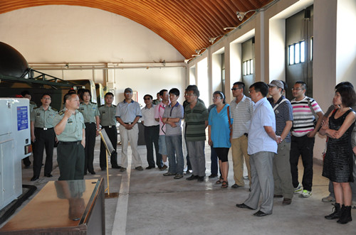 在基地工作人员的带领下,公司一行人员先后参观考察了基地靶场瞭望塔、基地展览室、环境试验站、轻武器所、测试站、发射炮位等处。基地靶场瞭望塔位于基地靶场的中心位置,高约三四十米,主要用于观察整个靶场的环境情况。我们饶有兴致的登上了瞭望塔,放眼望去,整个靶场尽收眼底,真有“会当凌绝顶,一览众山小”的感觉。在基地展览室,讲解员向我们介绍了由长春光机所研制、我公司生产制造的各类经纬仪,并着重讲述了这些设备的主要性能和功能,以及在配合武器装备使用过程中的优势和特点。听了讲解员生动的讲解,再看到这些我们亲手制造的设备,心中不免一阵热情涌动,那一瞬间,我们觉得能为祖国的国防建设事业贡献自己的一份力量真的是无比骄傲和自豪,我们无愧于党、无愧于祖国、无愧于公司!步入环境试验站,工作人员陆续向我们介绍了高低温试验室、淋雨试验室、盐雾试验室等各类装备环境试验室的主要功能和性能指标,先进的实验技术、完备的实验设施,让我们着实觉得祖国国防事业在党的领导下,正随着科技的进步日益强大。走进轻武器所,工作人员向我们介绍了不同时期、不同类型的火炮、榴弹炮、迫击炮、手枪、步枪、冲锋枪等轻型武器,让我们第一次近距离的接触这么多枪械和弹炮,深切的感到了祖国武器装备发展的伟大历程,也鼓舞着我们奥普光电人将不遗余力的为祖国国防建设事业贡献智慧和汗水。随后,工作人员又带领我们来到了发射炮位置,现场为我们发射了两颗炮弹。说实话,对于我们大多数人来说,这种场景只是在电视上看到过,这么近距离的亲身体验还是第一回,武器装备的巨大威力,让我们真切的体验到了国防事业的庄严和重要性,奥普光电人将矢志不渝的致力于国防建设事业!此外,基地工作人员还向我们介绍了其他测试设备和设施。
