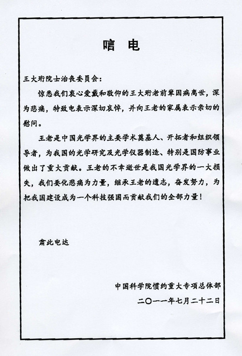 中国科学院惯约重大专项总体部唁电