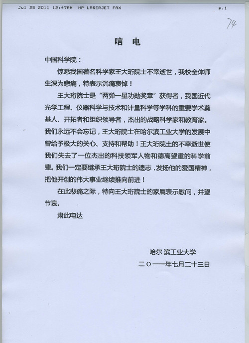 哈尔滨工业大学唁电
