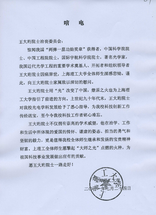 上海理工大学唁电