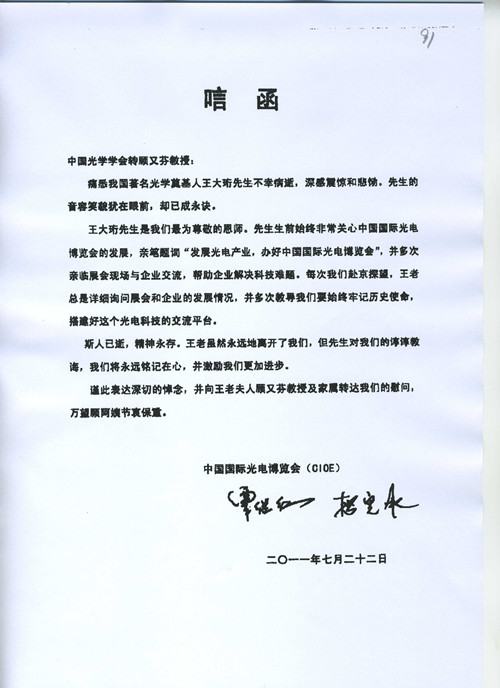 -中国国际光电博览会(CIOE)唁电