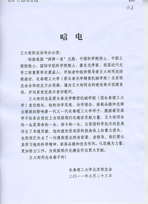 长春理工大学北京校友会唁电
