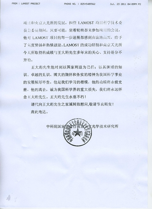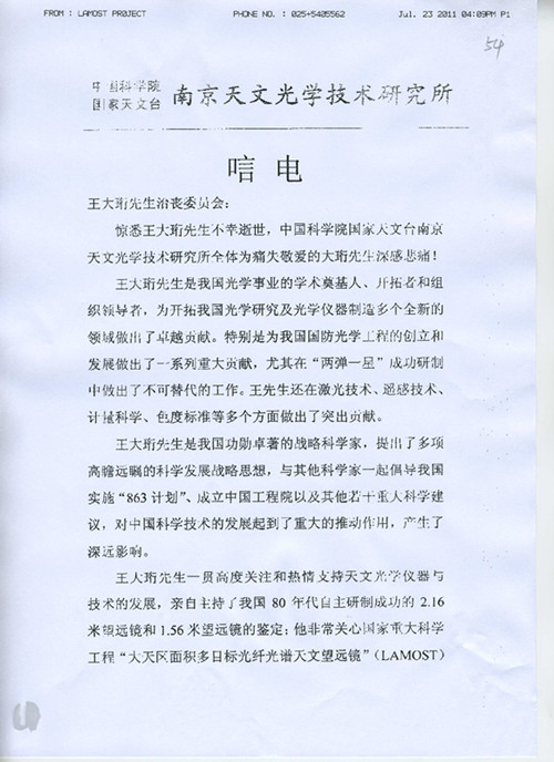 中国科学院国家天文台南京天文光学技术研究所唁电