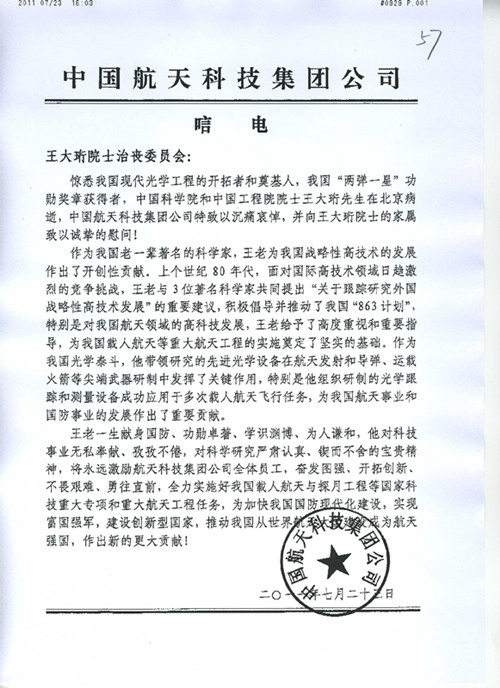 中国航天科技集团公司唁电